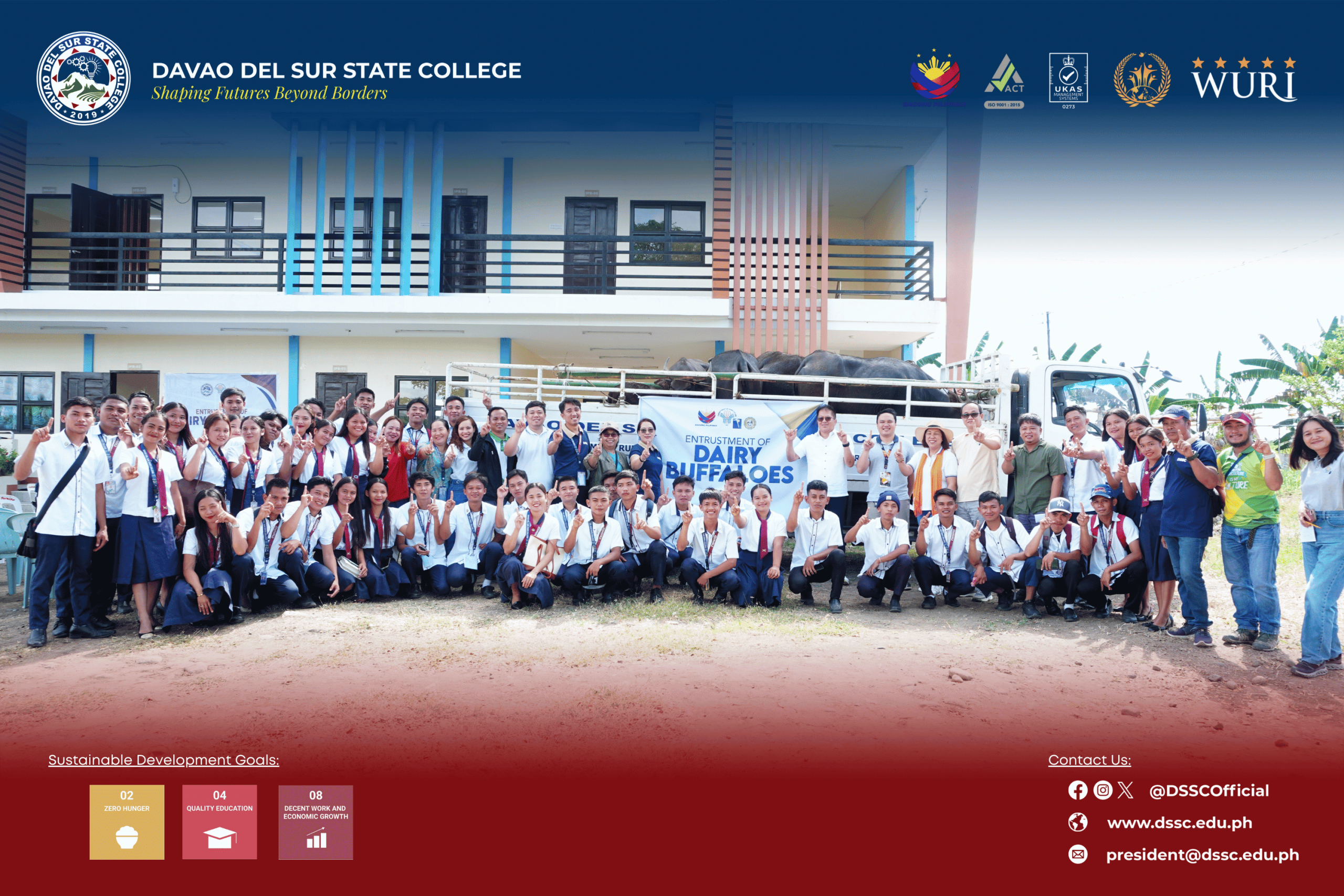 The entrustment of dairy buffaloes marks a significant step in strengthening DSSC’s Agriculture Program and reinforces its commitment to providing quality, practice-based education for future agricultural professionals. The initiative supports the achievement of the Sustainable Development Goals, particularly SDG 2 (Zero Hunger) through strengthened livestock and dairy production, SDG 4 (Quality Education) by enhancing hands-on agricultural learning, and SDG 8 (Decent Work and Economic Growth) by preparing students with industry-relevant skills.